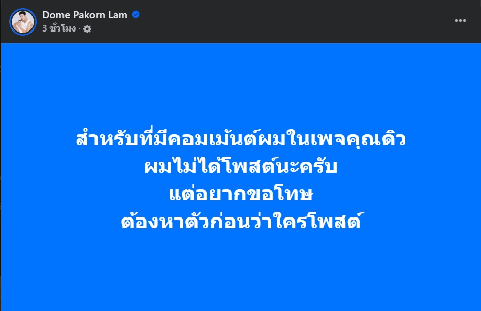 หลังทนกระแสไม่ไหวเฟซบุ๊ก “โดม ปกรณ์ ลัม” โพสต์ว่า “สำหรับที่มีคอมเม้นต์ผม ผมไม่ได้โพสต์นะครับ ต้องหาตัวก่อนว่าใครโพสต์”