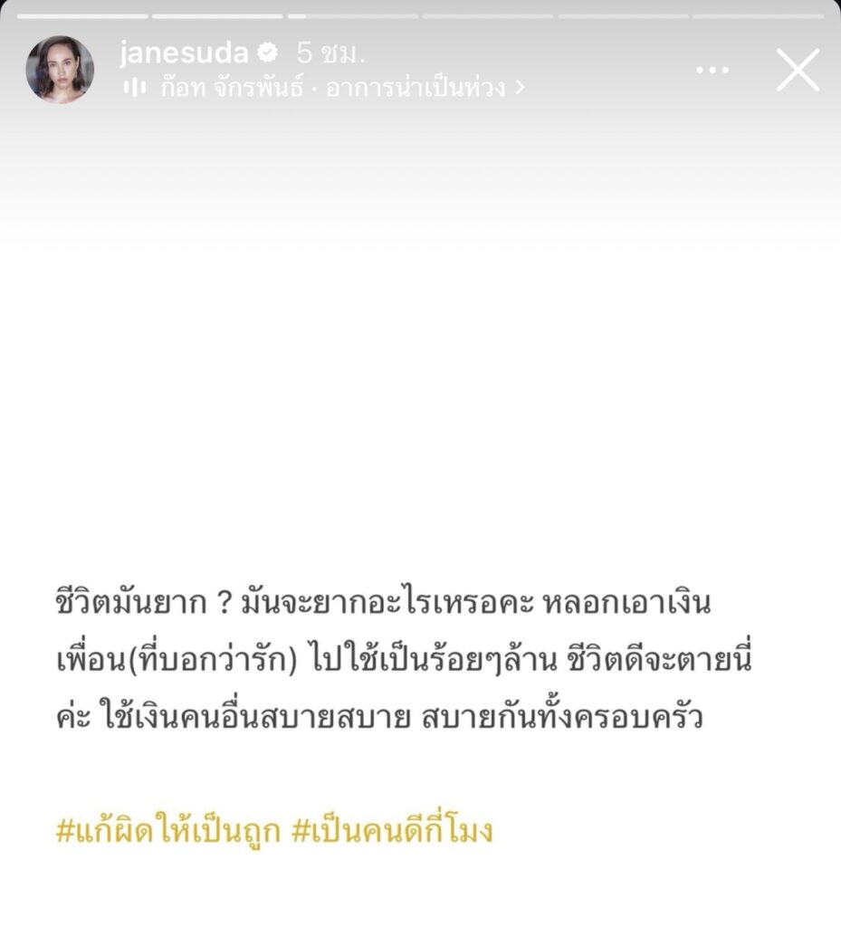 “ชีวิตมันยาก มันจะยากอะไรหรอคะ หลอกเอาเงินเพื่อน (ที่บอกว่ารัก) ไปใช้เป็นร้อยล้าน ชีวิตดีจะตายนี่คะ ใช้เงินคนอื่นสบายๆ กันทั้งครอบครัว” แน่นอนว่างานนี้แม่เจนทิ้งแฮชแท็กสุดจี๊ดไว้ว่า #แก้ผิดให้เป็นถูก #เป็นคนดี